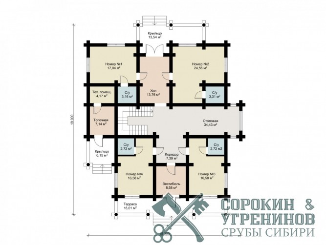 Проект большого гостевого дома из бревна диаметром 300мм, размер сруба по осям 15,3х19мм, общая площадь дома 362м2, объём бревна в срубе 280м3. Большой дом имеет восемь номеров. На первом этаже четыре комнаты с санузлом в каждой, холл, гостиная, два выхода не террасу, котельная, вестибюль, столовая, техническая комната. На втором этаже четыре комнаты, санузел в каждой комнате, и свой выход на балкон.