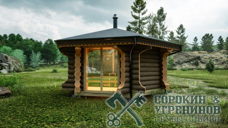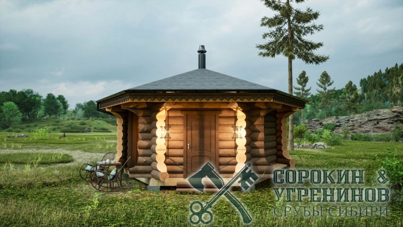 ХанБаня. Новый наш проект срубовой бани рубленый из бревна по форме Алтайского Аила, площадью 22м2. Сруб Аил-бани рубленый из бревна кедра диаметром 280мм, его размер по осям 6 на 6 метров. Объём бревна в срубе 20м3. Рубка сруба в классическом русском стиле с выделением карнизных балок. Большие панорамные окна в парной и комнате отдыха, придают невероятно стильный колорит бане, и отличный обзор изнутри. Отличительная особенность такого сруба шестиугольная форма в виде Алтайского дома Аила. Нет лишних помещений, только парная 11м2 и комната отдыха 11м2, и в ней же можно установить душевую кабину, хотя помыться можно и в парной. Обращаем Ваше внимание, данный проект мы решили показать на банном фестивале в Суздале, августе 2024. Сейчас производится наполнение, изобретена эксклюзивная печь Химера от ТМФ специально для фестивали и этой бани.
