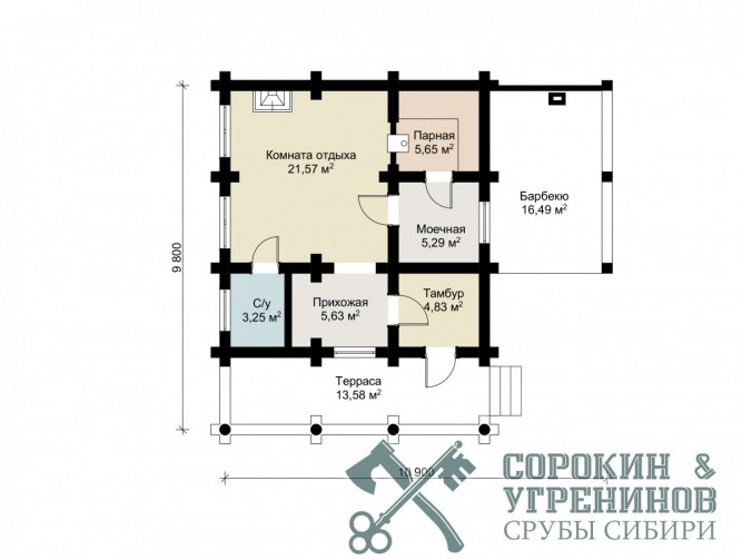 Сруб бани рубленый из бревна кедра диаметра 280мм площадью 76,3м2. Размер сруба 9,8х10,9 метров по осям. Баня с барбекю, есть терраса, прихожая и тамбур. Парная, мойка, комната отдыха и сунузел. Сруб рубленый вручную в русскую чашу (охлоп), брёвна окоренные гидро-окоркой (водой под высоким давлением), а так, же это можно сделать скобелем или лопатой, или строганное рубанком. Объем бревна в срубе 68м3. Баня установлена в Новосибирской области в 2014 году в поселке Ваганов Парк.